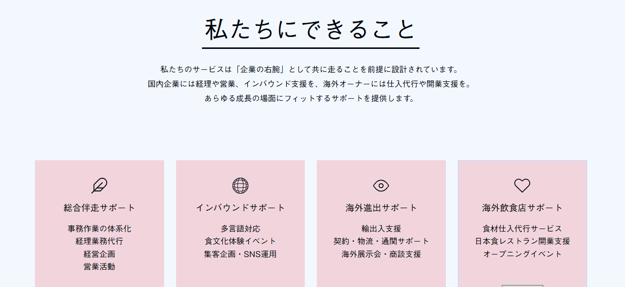 事業内容 | 海外進出に関する伴走型サポートを行っております。 特に食料品関係でのご支援を得意にしており、東南アジア周辺に提携できるサポーターを確保しているため、市場調査などスムーズに行えます。 また、アドバイスだけに留まらず、貴社の一海外事業部員として伴走型で支援させて頂きます。 自社での海外展開に限界を感じるハードルも多々あるかと思いますが、組織の体系化さえ整えば決して難しいものではありません。 是非一度おはなしお聞かせください! |