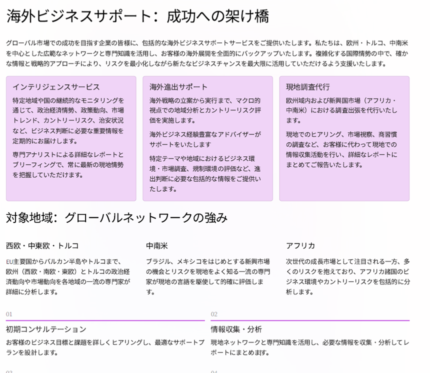 | 事業内容 | 1.インテリジェンスサービス 1.1. インテリジェンス活動サポート 社内のインテリジェンス機能の代行(アウトソーシング) 特定地域(国)のモニタリング:定期レポートとブリーフィング(政経情勢、政策動向、カントリーリスク、治安情勢等)等 対象地域:欧州(西欧、中東欧、バルカン)、トルコ、ロシア・CIS、 中南米、米中関係 ・特定地域のマクロ情勢に関するよろず相談 ・特定のテーマや地域(国)に関する調査・分析レポートの作成 ・欧州域内および新興国市場の市場調査出張代行等 1.2. 海外進出(戦略)サポート(案件ベース) ・海外進出の際にマクロの観点から地域・国情勢やカントリーリスク分析 ・特定国の市場調査 2.自治体サポート ・欧州を中心に海外からの企業誘致サポート ・自治体の海外戦略立案・施行サポート ・地元企業の海外進出サポート |