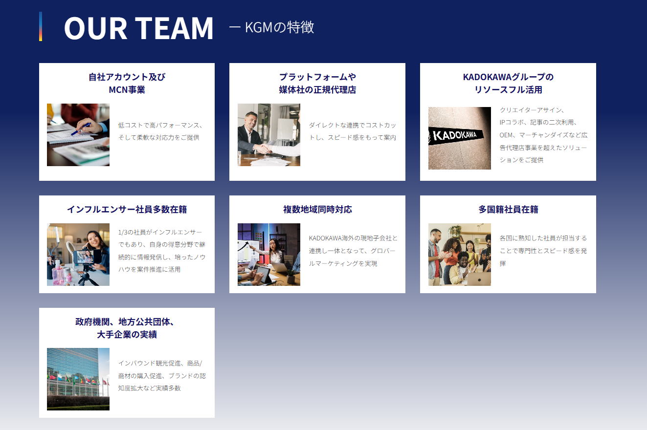 一般的な広告代理店の枠を超え、親会社であるKADOKAWAグループが持つ膨大なIP(知的財産)、クリエイター、メディア、そしてノウハウを事業にフル活用できます。これにより、エンタメ性の高いプロモーション、メディアとの連携、記事の二次利用といった、競合他社には真似のできない複合的なソリューションを提供します。