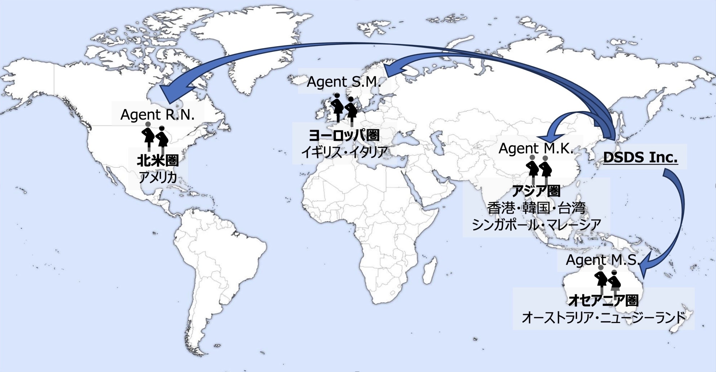 ⚫ 市場の大きいアジア圏、北米圏、オセアニア圏、ヨーロッパ圏向けにエージェントを配備しており、現地慣習に適合したスピーディな開拓が可能です