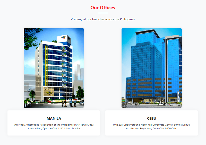 【CEBU office】 Upper Ground Floor, FLB Corporate Center Bohol Avenue, Archbishop Reyes Ave, Cebu City, 6000 Cebu 【MANILA office】 7th floor, Automobile Association of the Philippines Tower (AAP Tower) - Offices, 1 slot parking available, 683 Aurora Blvd, Quezon City, 1112 Metro Manila |