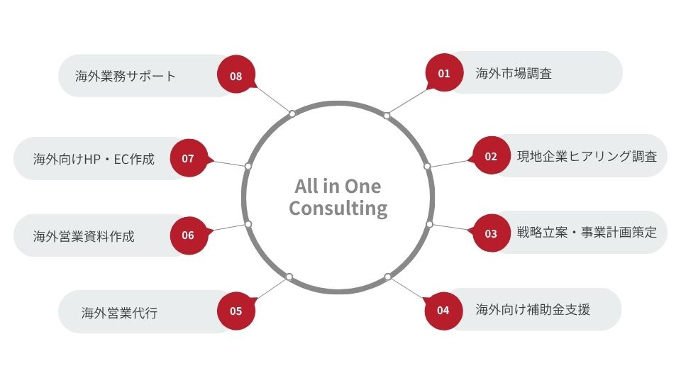 貴社の商品やサービスを踏まえ、日本を含め世界のどの市場が効率的に売上拡大を見込めるかリサーチ・提案致します。