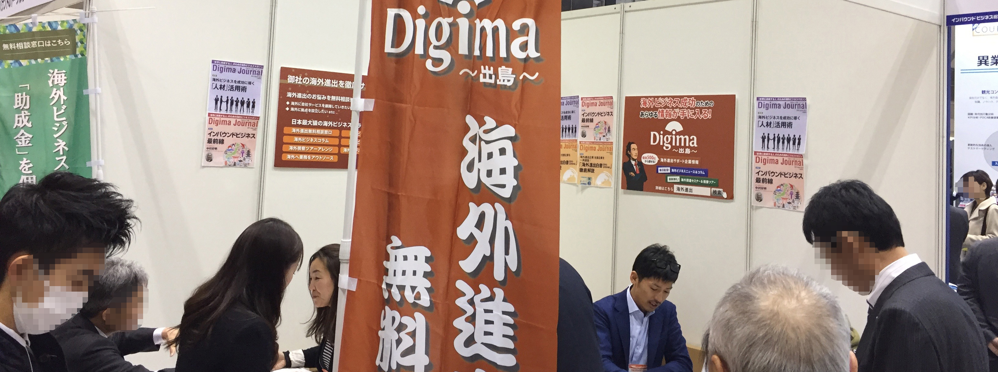 「Digima〜出島〜」ブースでは、「海外進出に関わる、あらゆるサービスが揃う“海外ビジネス支援プラットフォーム”」としてのサービスをうたいつつ、「海外進出無料相談窓口」に加えて、「助成金を活用した海外ビジネス研修」に関するレクチャーなど、インバウンドはもちろんのこと、Digima〜出島〜ならではのアウトバウンドに関するサービスもアナウンスさせていただきました。