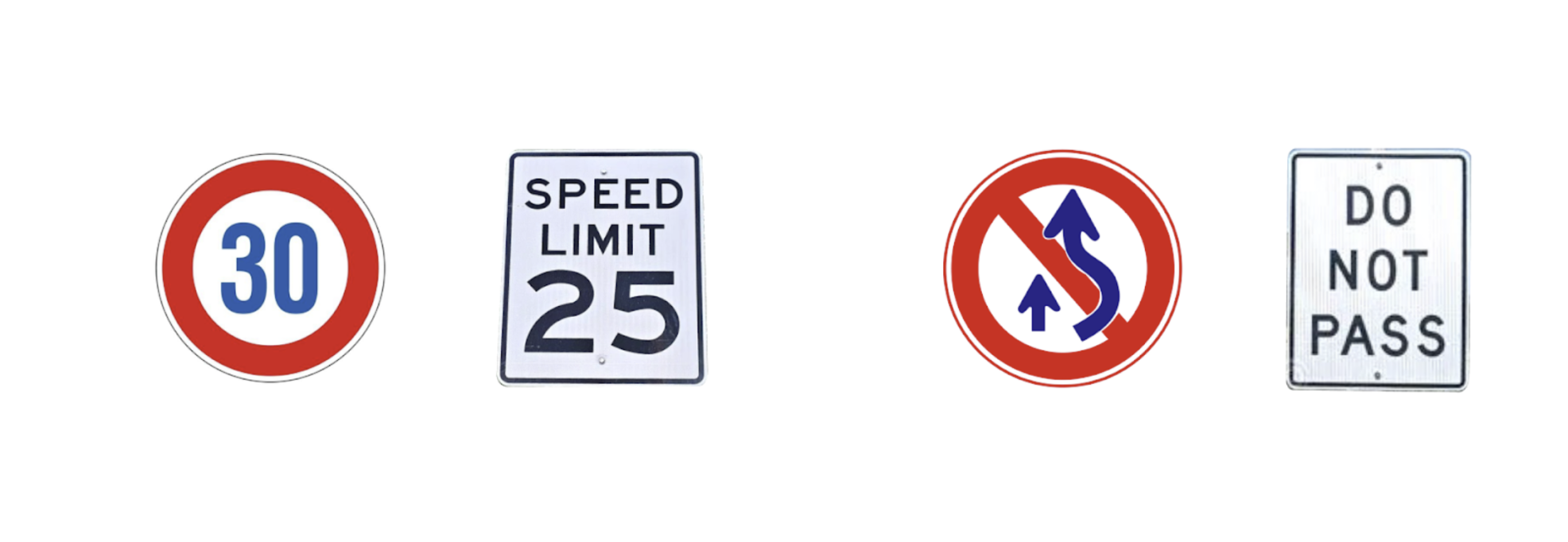 左が時速制限、右が追い越し禁止ですが、日本(左)とアメリカ(右)を比べると、アメリカでは文字が基調になっています。以下は標識の応用編です。
