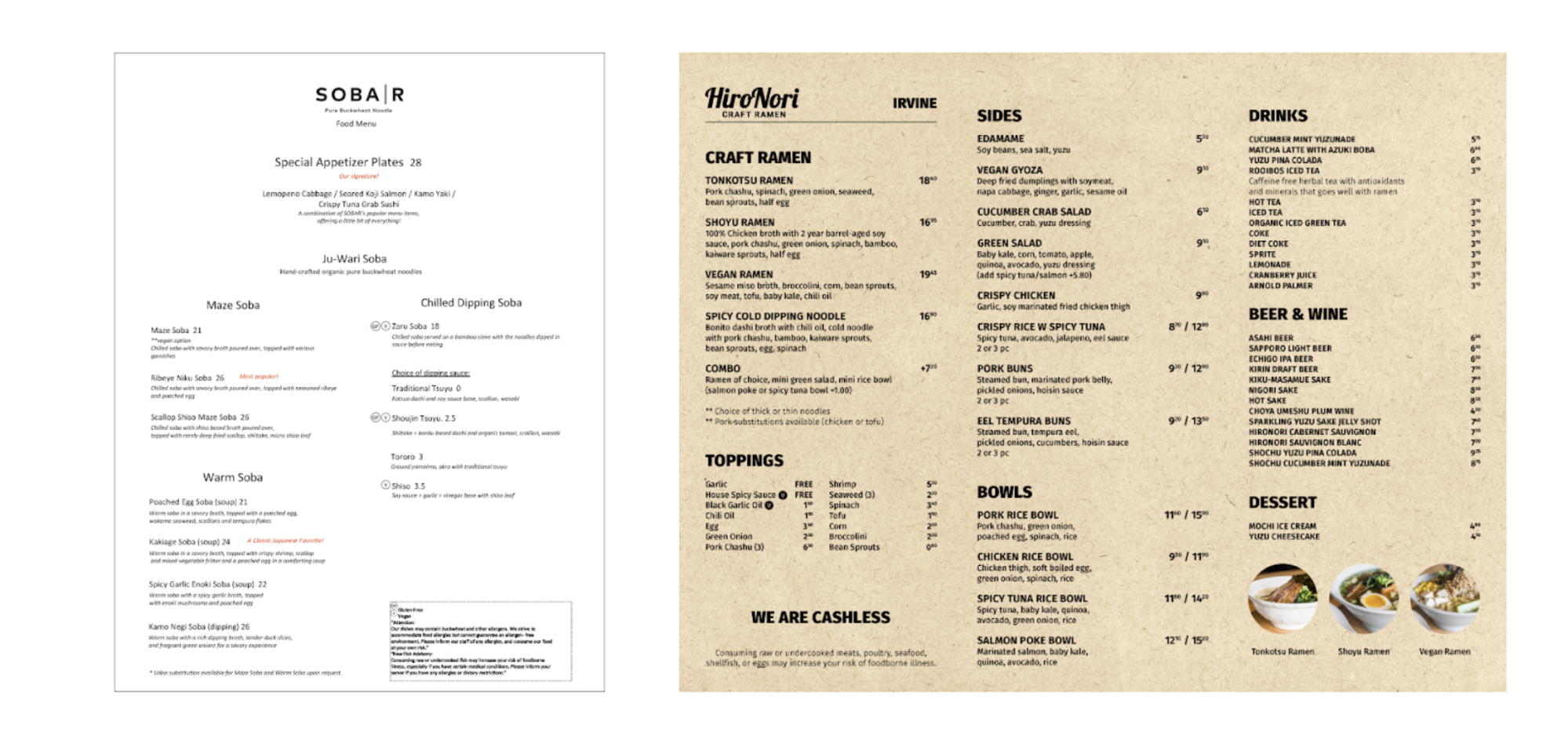 通常日本のものは作り方や注意表記にピクトグラムを使用しているものが多いです。一方アメリカのものは見ての通り全て文字表記です。最後の事例です。レストランに行くと以下のようなメニューが出てきます。