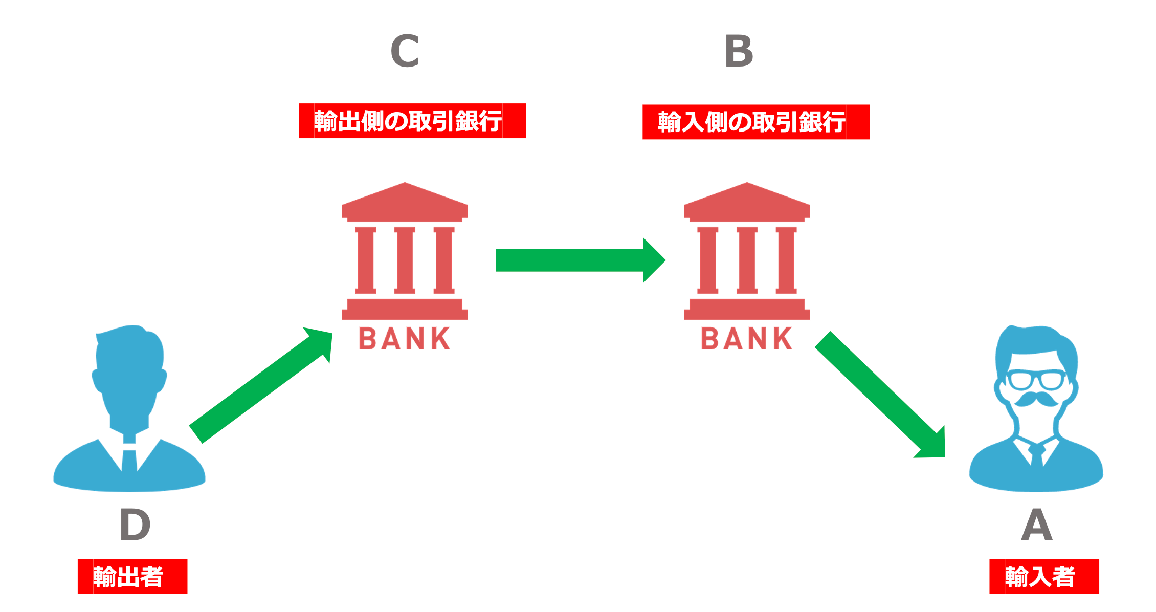 また、後半の「C:輸出者」から「A:輸入者」へのお金の流れは図解すると下記のようになります。