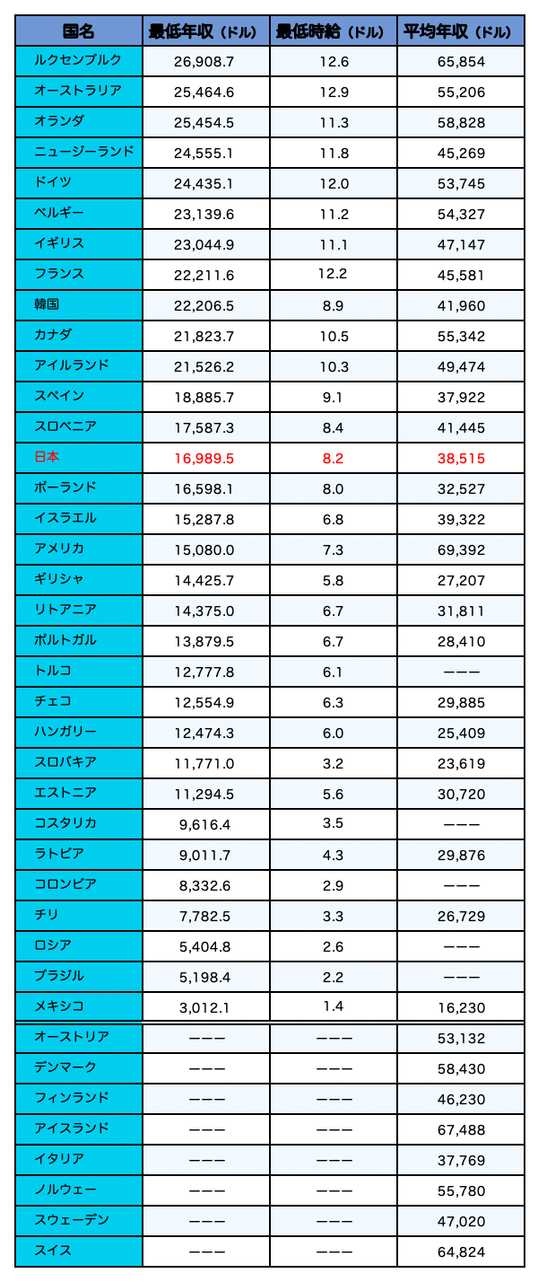 ▼世界の最低賃金・平均年収ランキング(2020年版) | 先進国で最低・アジアでトップ圏内の日本の最低賃金