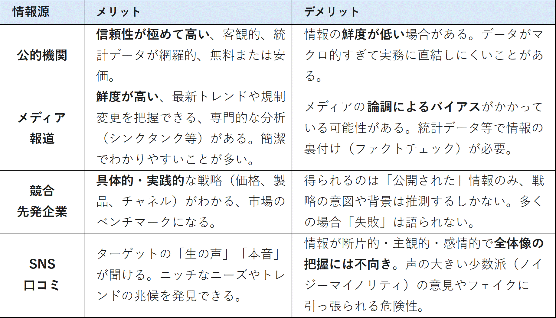 これらの情報源は一長一短であり、偏った情報収集は判断を誤らせます。公的機関の「マクロな事実」と、SNSの「ミクロな本音」を組み合わせるなど、多角的に情報を集めることが重要です。以下の表は情報源のメリット・デメリットを簡単にまとめたものです。