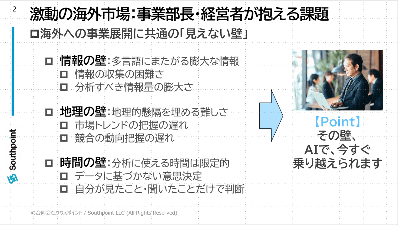 - 海外のエキスパートの「生の声」と「熱気」があなたの会議室に