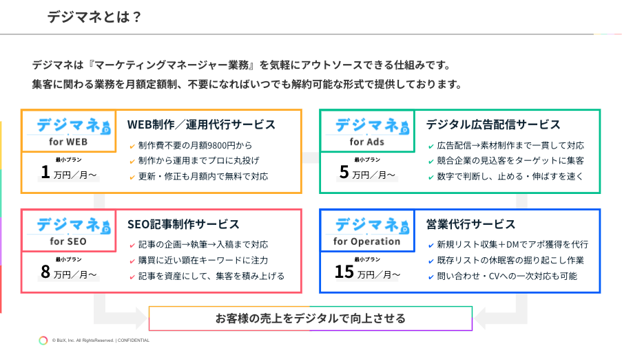 - 初期費用0円・丸投げOK。BtoB特化の「効果の高いWebサイト」を、月額で手に入れられる。運用もプロにお任せ。