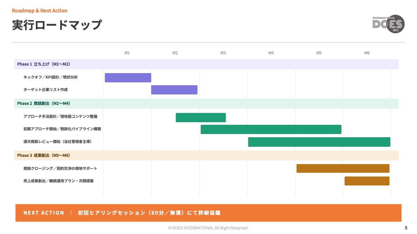 ターゲット業界・企業の絞り込みからアプローチ手法の設計、現地語コンテンツ整備までを当社で担当。