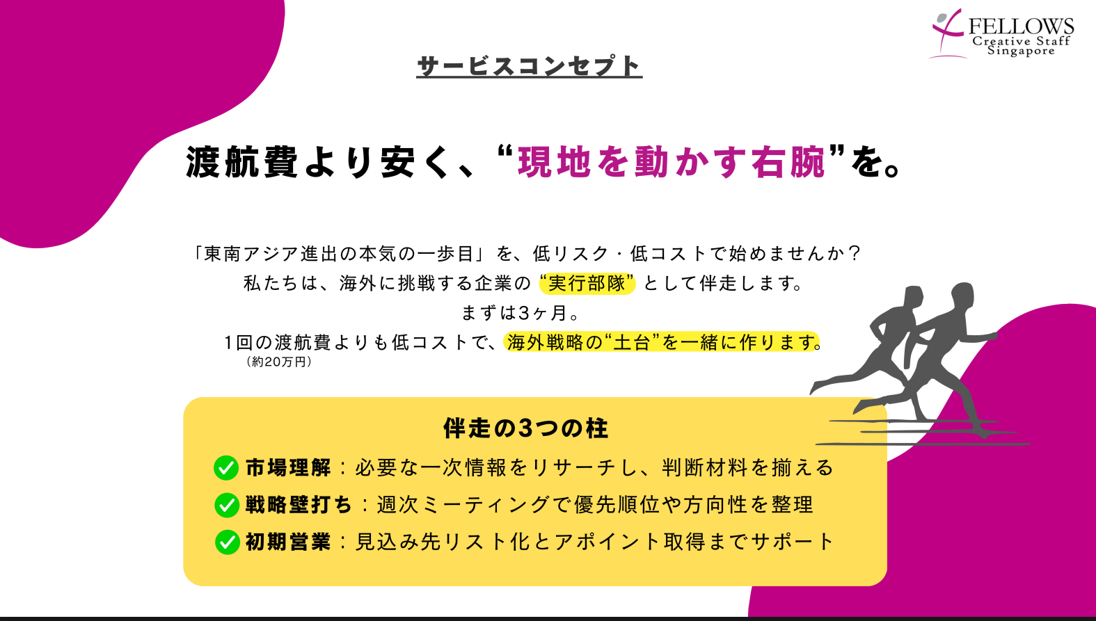 東南アジア進出の「市場調査・戦略策定・初期営業」支援・特典付 | Fellows Creative Staff Singapore Pte. Ltd.
