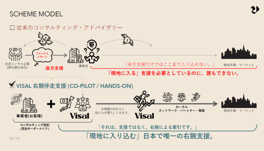 プライマリーデータに基づいた海外市場調査のノウハウ・実績、海外業界コネクションを活用し海外進出に向けたハンズオンコンサルティングを提供いたします。