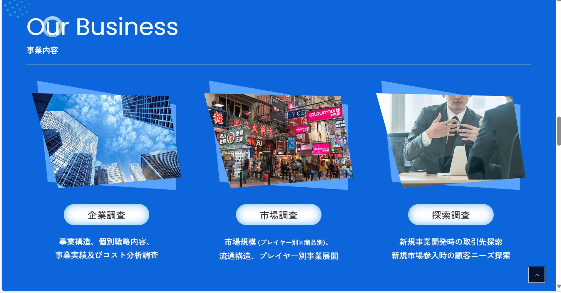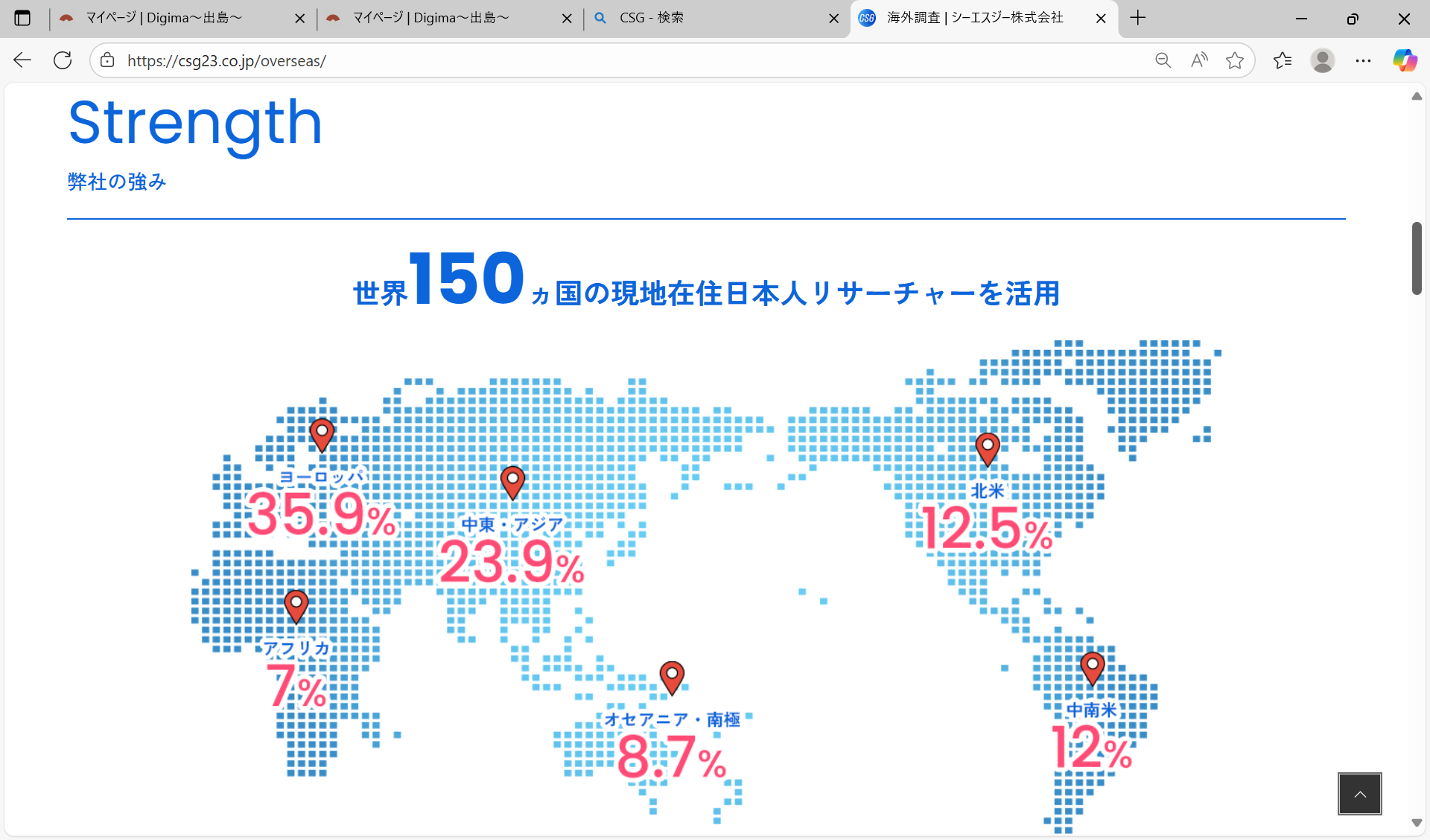 - CSGは、大手企業の皆様の海外事業展開を強力に支援するため、国内および海外における以下の専門調査を行っています。私たちは、インターネット上の情報では把握しきれない現場の「生きた情報」を直接取材と綿密な